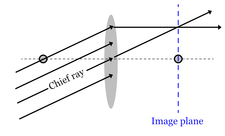The rays from a distant point off the optical approach the entrance as parallel to one another but oblique to the optical axis. The ray that passes through the center of the lens is called the chief ray. There will also be a ray that passes through the primary focal point. It will be refracted by the lens and emerge as parallel to the optical axis. These two rays intersect where the image of the point will be formed.