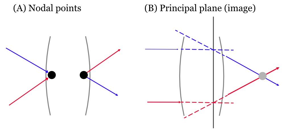 For a thin lens, we noted that a ray passing through the optical center is undeviated. A thick lens has a similar concept, but it involves two nodal points (\(N_1\) and \(N_2\)). A ray directed toward the object-side nodal point (\(N_1\)) emerges from the lens as if it came from the image-side nodal point (\(N_2\)), traveling parallel to its original direction (Panel A, Figure 10.1).