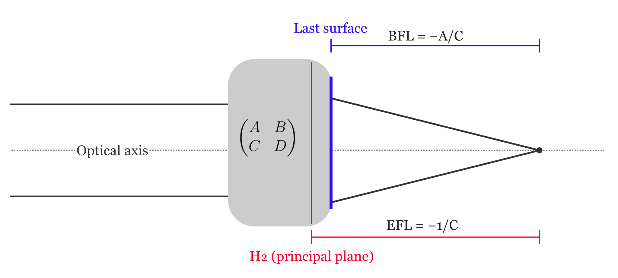 We can compute two particularly valuable system properties from the system matrix: the back focal length (BFL), \(f_B\), and the effective focal length (EFL), \(f_E\). The BFL is the distance from the system’s output reference plane to the focal point (for an object at infinity). The EFL is the distance from the secondary principal plane to the focal point.