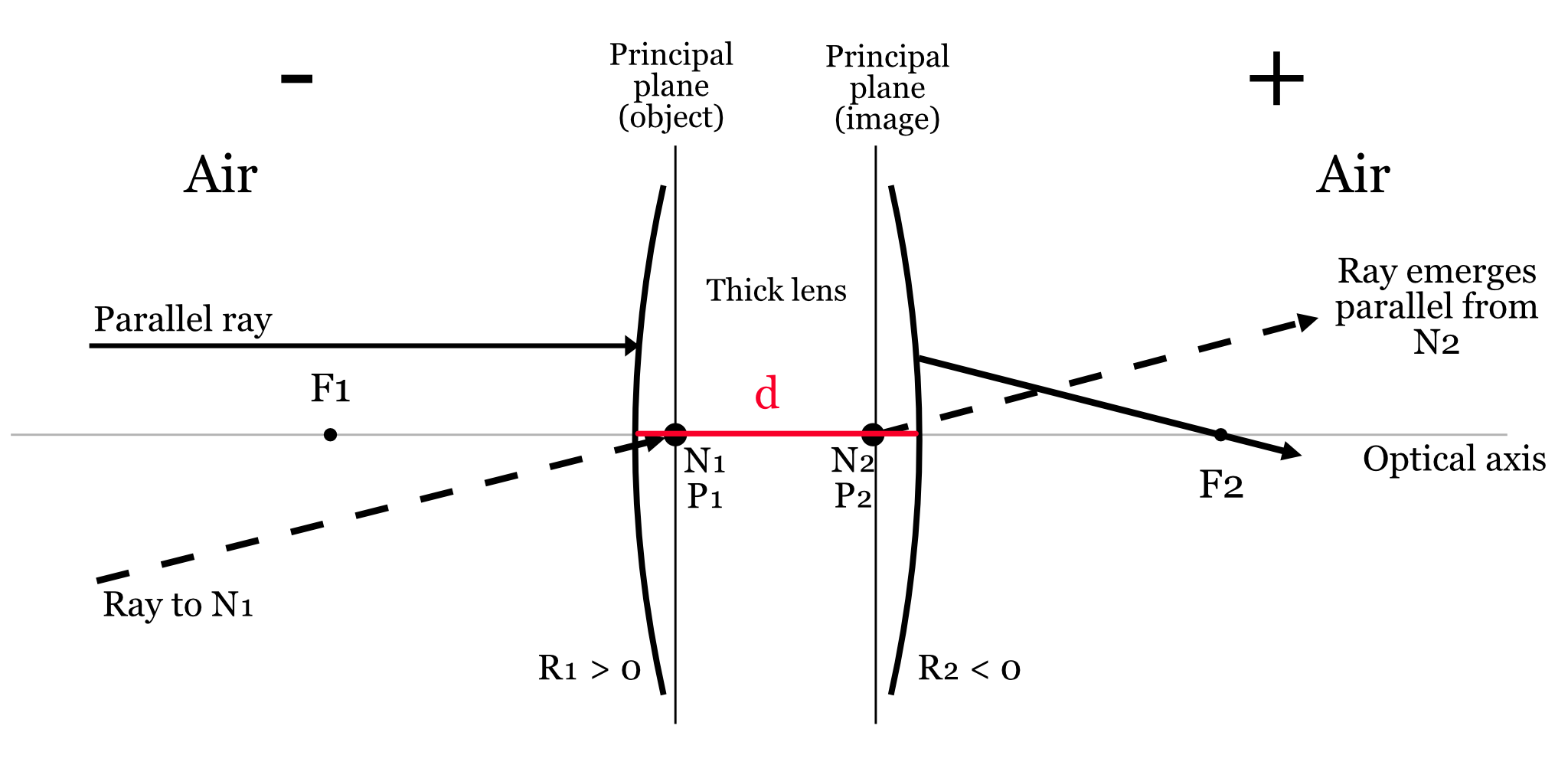 In the general case, a thick lens is characterized by six cardinal points: two focal points, two principal points, and two nodal points. However, in the common situation where the medium on both sides of the lens is the same (e.g., air), the nodal points coincide with the principal points. This simplifies the system considerably (Figure 10.2).
