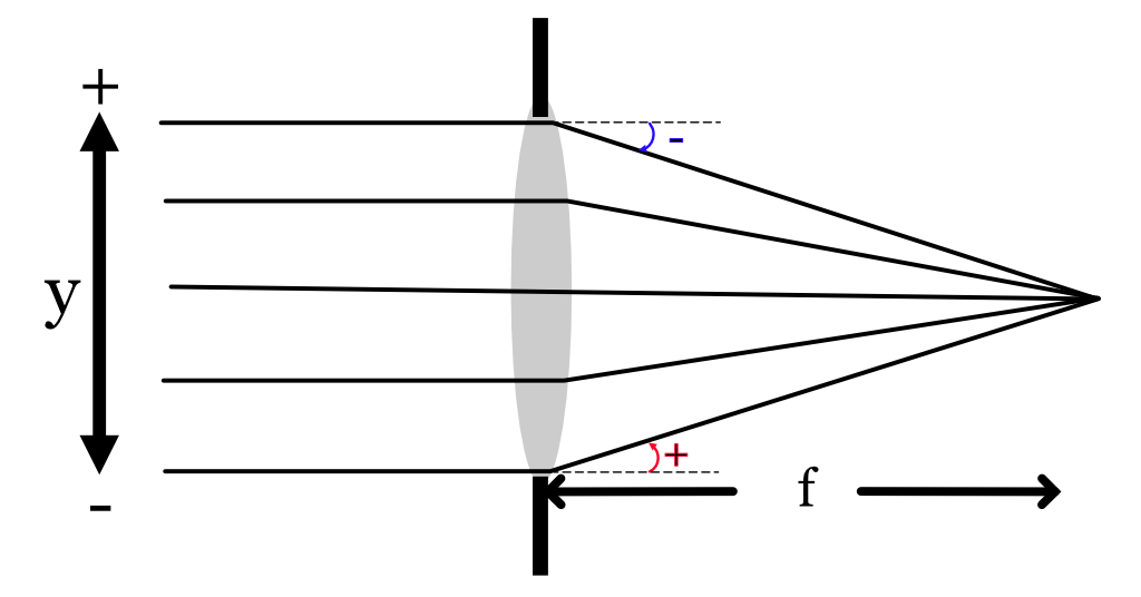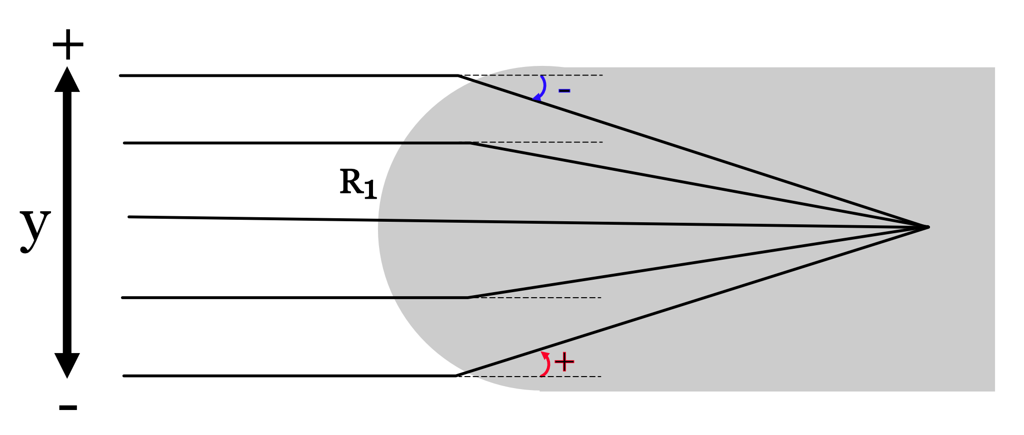 Snell’s Law tells us how the rays change direction at the first surface of a spherical lens (Equation 8.1). As you can see in Figure 10.6, the rays change direction by an amount that depends on their field height. The critical point -I won’t show the derivation- is that the amount of change is proportional to field height. In the paraxial regime the change is the same, no matter what the input ray angle.
