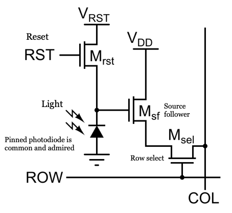 The original CMOS pixel design uses a three-transistor (3T) circuit to store and read out the charge collected by the photodiode (Figure 15.4). Each pixel contains three key transistors: \(M_{rst}\) (reset), \(M_{sel}\) (select), and \(M_{sf}\) (source follower). The \(M_{rst}\) transistor resets the photodiode by connecting it to the supply voltage (Vdd), clearing any residual charge before image capture. The \(M_{sel}\) transistor selects a specific row of pixels, connecting them to the readout circuitry. The \(M_{sf}\) transistor acts as a buffer, transferring the stored charge to the analog-to-digital converter (ADC) for measurement. In most sensors, each column has its own ADC, but some designs use a single ADC shared among multiple columns—a technique known as multiplexing (mux).