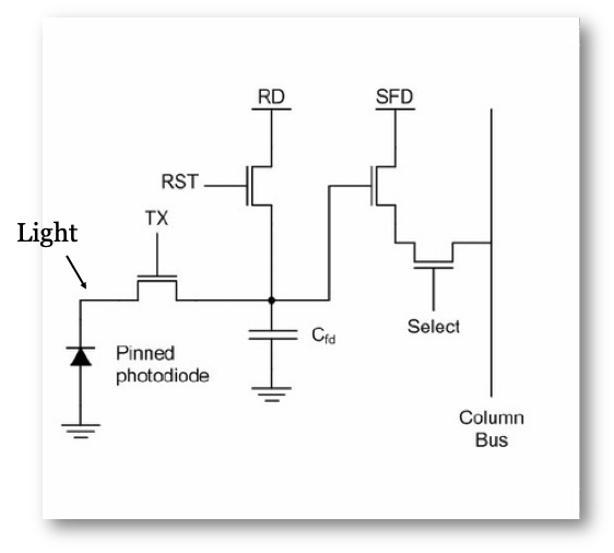 Since about 2000, most CMOS image sensors have used a four-transistor (4T) pixel circuit (Fossum and Hondongwa 2014). The 4T pixel adds two important features: a pinned photodiode (PPD) and a transfer gate transistor (Figure 15.5). The pinned photodiode improves charge storage and reduces noise, while the transfer gate allows precise movement of the collected charge from the photodiode to a storage node called the floating diffusion, which has a capacitance \(C_{fd}\). The other circuit elements—reset, row select, and source follower—remain the same as in the 3T design.