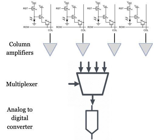 The use of unity gain amplifiers at the pixel was one important innovation. A second innovation is the way the pixel data are read from the image sensor. In the original CCD devices, the important innovation was to find a way to move the electrons across the silicon array to a single analog-to-digital converter. But the electrons in the CMOS pixels are voltages on a large number of output lines. How shall we convert the voltages on all of these separate lines into digital readout values?
