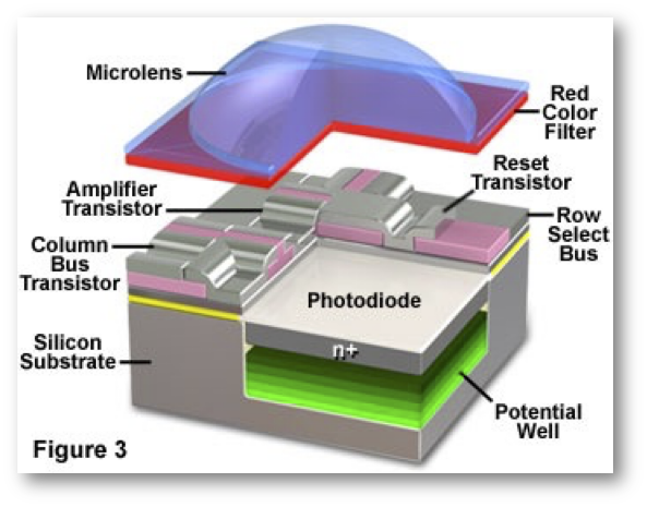 Additionally, both the photodiodes and their associated circuitry share the same substrate. Requiring the circuitry and photodiode to share space reduced the sensitivity of the sensor. Finally, the original pixels were fairly large, \(6 \mu \text{m}\) or more. As technology scaled and pixels became smaller -many CMOS imagers have pixels as small as \(0.8 \mu \text{m}\) and a reduction in area of \(50x\)- additional problems arose. Different opportunities arose as well.