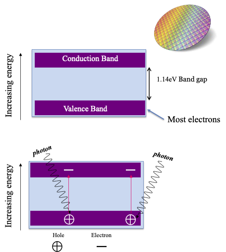 Atoms in a silicon semiconductor are arranged in a crystalline structure, and their electrons occupy specific energy levels grouped into two main bands: the valence band (lower energy) and the conduction band (higher energy). Under normal conditions, most electrons remain in the valence band. When a silicon atom absorbs a photon, an electron can be excited from the valence band to the conduction band (Figure 15.1).